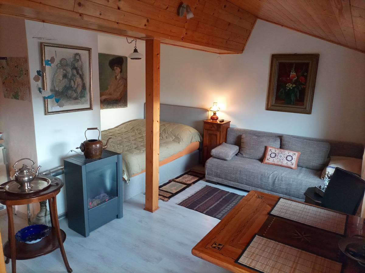 Studio la mansardă parțial antic, parțial modern mobilat (28 mp), cu chicinetă modernă, la etajul 2, liniștit, însorit, confortabil. Se poate folosi terasă cu grajduri de grădină cu grădină de trandafiri. Autobuzul 305 (centrul orașului, gara centrală, Festspielhaus) la 50 m, 15-20 de minute de mers pe jos romantic până în centrul orașului (Rotmaincenter, cinema, zonă pietonală) la Mistelbach enlang, Supermarket, bancă, restaurante, benzinărie la 300 m distanță Mașină de spălat în subsol