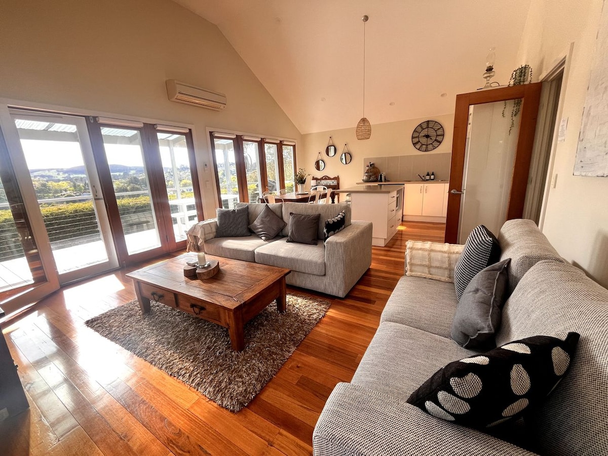 A country escape for nature lovers. Very spacious with large lounge dining room leading out to front deck with spectacular views along with 2nd sitting room with a BBQ deck. Both bedrooms have a king bed and storage. There are 2 bathrooms one up and one down and a second toilet off the laundry downstairs Well equipped kitchen including pizza oven and espresso machine. Your welcome pack consists of home made pizza and fudge. Fire place available from 1st May to 30th September.