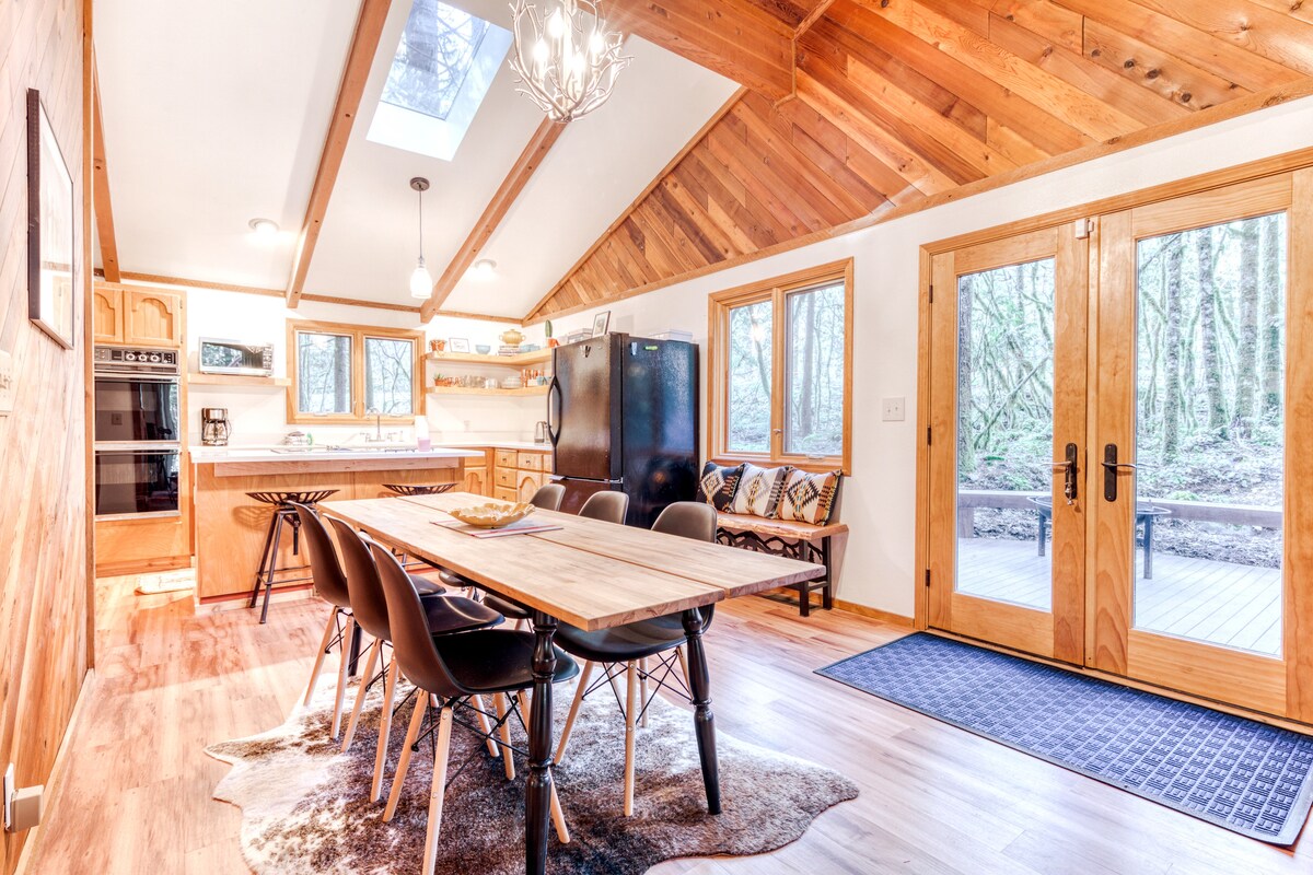 Cabana Riverside este o cabană liniștită și confortabilă pe malurile râului Sandy, într-un cartier liniștit, la doar 1 oră de mers cu mașina de Portland. Cabana are un plan deschis, excelent pentru ca familia și prietenii să se bucure unul de compania celuilalt în timp ce gătesc și se relaxează lângă foc. Vizitatorii se pot bucura de o ședere prelungită și pot lucra aici în intimitate. Designul său de inspirație scandinavă include tavane boltite, grinzi expuse și un solar, toate construite cu atingerea unui meșteșugar.