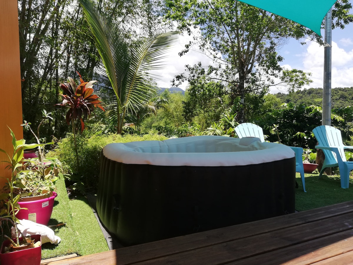 Fermecător, decorat cu gust bungalou situat între mare și munte, oferind vederi excepționale ale Sfinților și Marie-Galante de la o terasă magnifică din lemn cu jacuzzi. Oaspeții se pot bucura de mare în măsura în care ochiul poate vedea și se pot bucura de confortul fiecărei camere deschise spre exterior. O locație perfectă pentru a accesa cascada de carbet 10min, stația de feribot pentru Saintes 7min, plajele de nisip negru 3min, Soufrière 25min.. Ideal pentru familii, prieteni...
