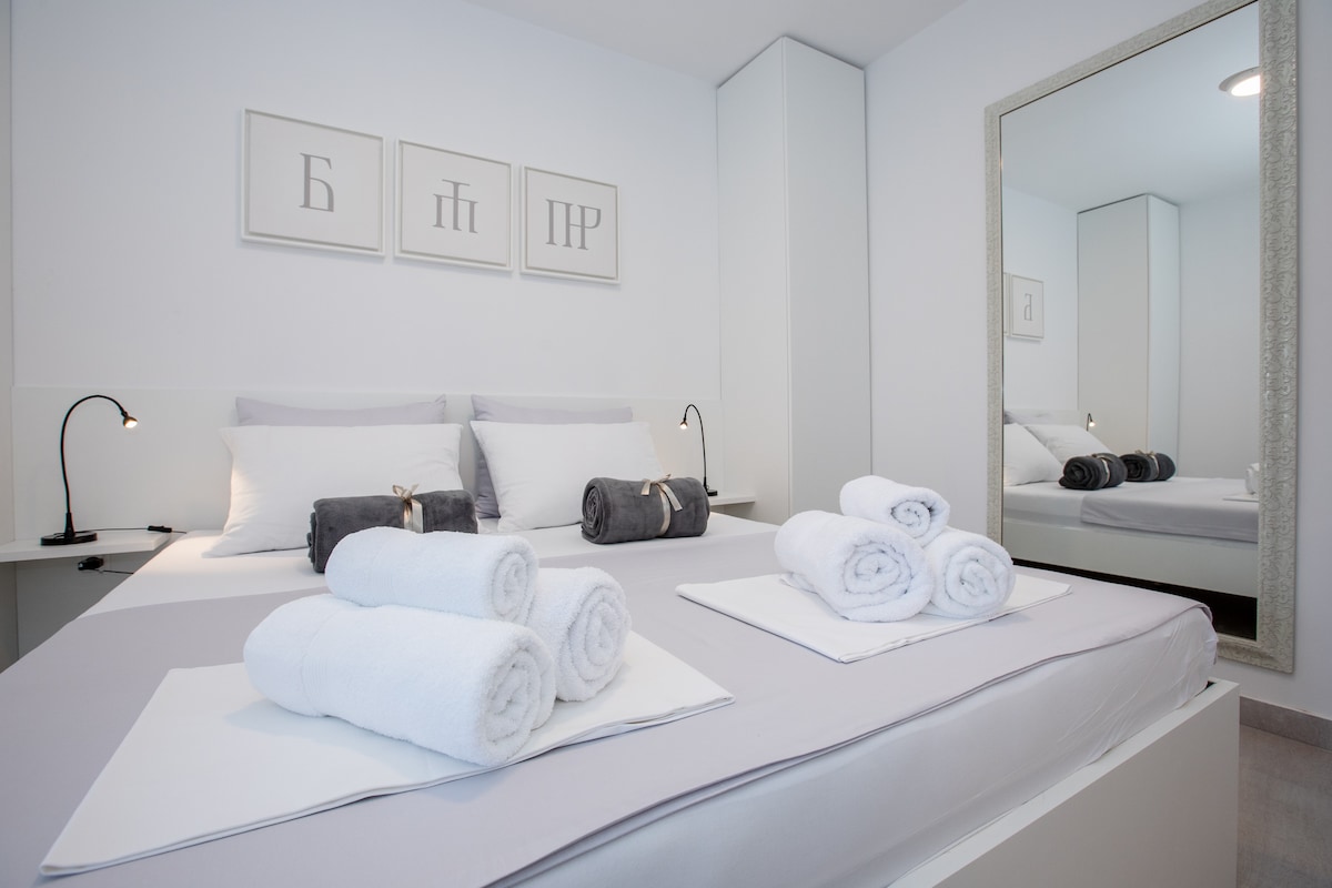 Mia Apartment este un apartament nou, modern, proiectat de designerul croat Mladen Orešić. Tot mobilierul este personalizat, cu design minimalist în alb, cu detalii albastre. Apartamentul are un dormitor cu pat dublu, baie, bucătărie și living cu canapea extensibilă. Apartamentul are un balcon cu vedere la mare și, de cealaltă parte a apartamentului, o terasă cu masă și canapea pentru odihnă de după-amiază sau cină romantică.