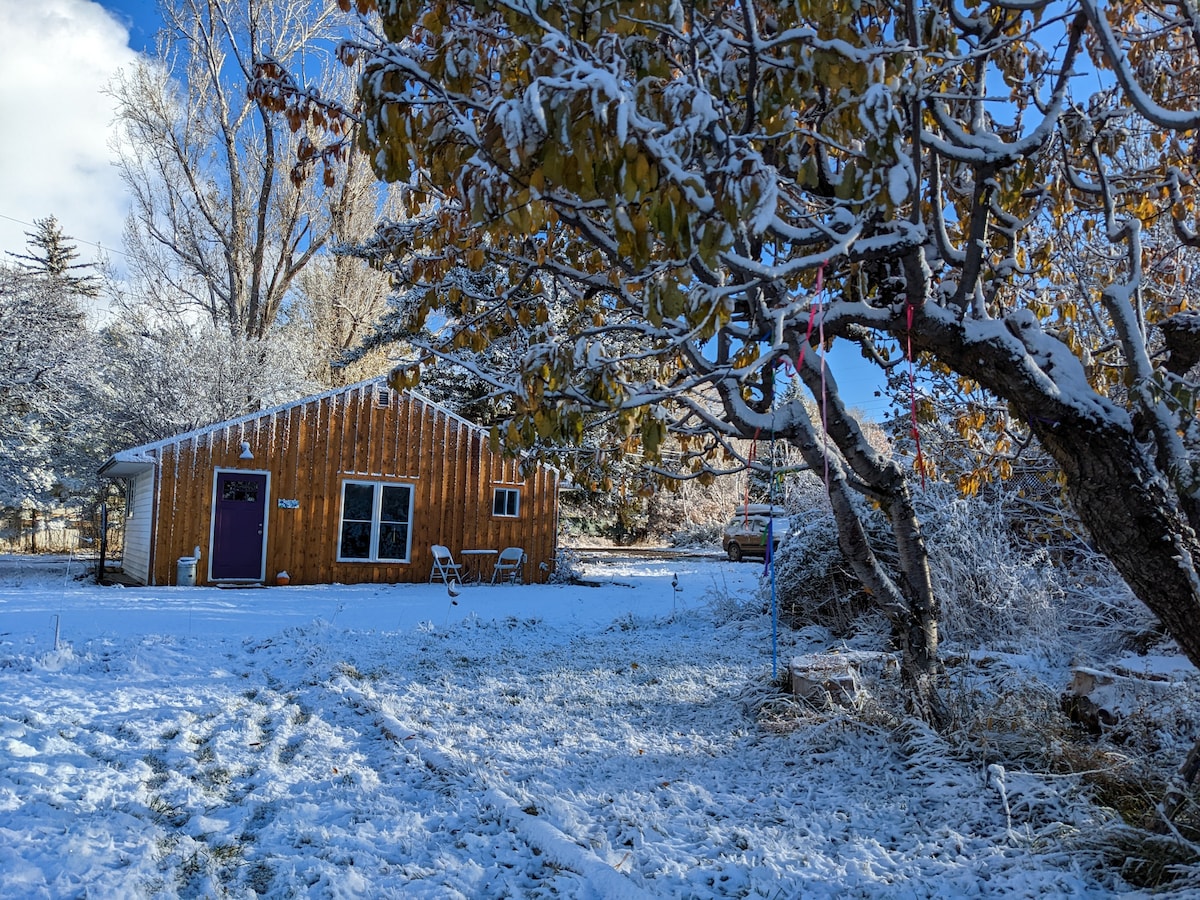 Relaxează-te în această fermă confortabilă, la doar 7 minute de centrul orașului Paonia. Cabana noastră privată, complet utilată, se află de-a lungul ramurii nordice a râului Gunnison - un loc ideal pentru cafeaua de dimineață lângă apă și sunetele liniștite ale râului. Bucură-te de priveliștile fermei noastre funcționale, ale livezii de mere vechi de 100 de ani și ale caprelor prietenoase. Plimbare ușoară cu bicicleta până la Crama Black Bridge.