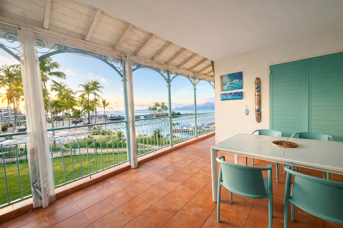 Apartament de lux de 150 mp în inima stațiunii balneare Saint-François, pe prima linie, cu vedere uluitoare la mare, la lagună, la surferi și la pelicani Plajă la 5 minute de mers pe jos: se pun la dispoziție șezlonguri Toate facilitățile la câțiva pași - 1 living/bucătărie mare, dotată, de 70 m2, cu vedere la mare uimitoare și mobilier din lemn - 1 suită de 20 m2 cu vedere la mare, cu 1 pat matrimonial de 180 cm - 1 suită cu vedere la mare, la etajul de 20 m², cu 1 pat de 160 și balconul său - 1 spălătorie Fără terasă exterioară