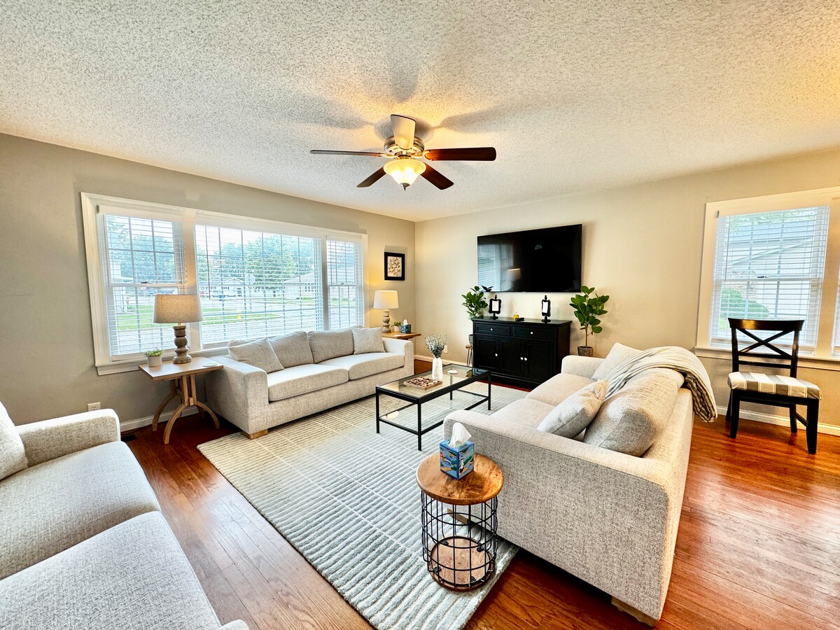 Bine ai venit la Lindsay's Landing, unde confortul întâlnește comoditatea. Această locuință elegantă se află la doar câțiva pași de Indiana Wesleyan University, restaurante excelente și cumpărături. În interior, vei găsi un plan deschis, o bucătărie complet utilată, Wi-Fi de mare viteză, un televizor inteligent și paturi confortabile cu lenjerie de bumbac Giza. Indiferent dacă ești aici pentru muncă, pentru a-ți vizita familia sau pentru a explora zona, te vei simți ca acasă. Animalele de companie sunt binevenite la cerere, pentru 12 USD pe animal, pe noapte.