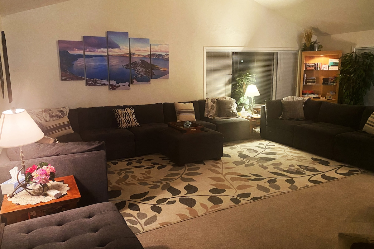 Perfect for Work Teams or Families to build lasting memories. Private home in Beautiful Scenic Medford Foothills! Close to everything, but out of town. Nearby dining and groceries. Quick drive to Ski Ashland, Crater Lake, Water Ski Lakes, Fishing Lakes, and Roxy Ann Winery. Hiking at Roxy Ann and Table Rocks. Vaulted Great Room, huge modular couch, 65" and 75" TVs, Redzone, Pool Table, Ping Pong, Coffee & Wine Bar, Golden Tee. Year-Round Hot Tub, Seasonal Swimming Pool (mid May-End of Sept.)