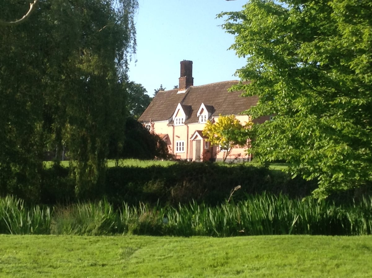 Converted rustic barn adjacent to main house. Access over gravel driveway. Private building with shared garden. Light and airy with French windows and roof lights. Exposed original beams. 2 rooms plus ensuite shower/loo. Please specify super kingsize OR twin beds when booking. Situated in a quiet village with easy access to Bury St Edmunds, Newmarket, Cambridge, Norwich and coast. Friendly hosts, chickens, dog and cats on property and fresh eggs supplied. Swallow barn is a writer’s paradise!