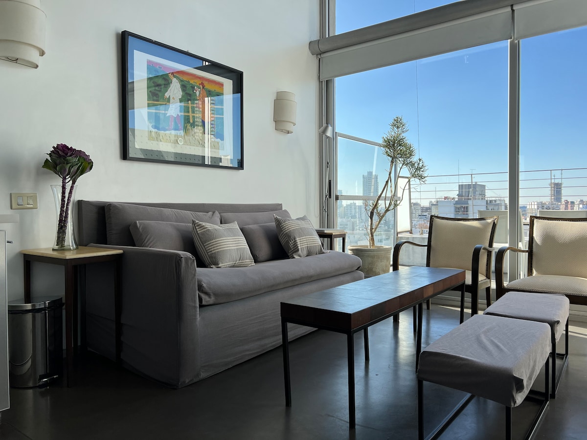 O bijuterie secretă din Buenos Aires. Bucură-te de priveliști panoramice uimitoare ale parcurilor Palermos, orizontului orașului și răsăritului de soare peste râul Rio de la Plata. Situat pe bulevardul Libertador, într-unul dintre cele mai sofisticate cartiere, înconjurat de multe cafenele și baruri la modă. Acest studio de tip penthouse se află în partea de sus a unei clădiri tradiționale și istorice, ieșind în evidență cu detalii și funcționalități de design de înaltă calitate. A fost premiată în reviste de design prestigioase. Trăiește un Buenos Aires unic.