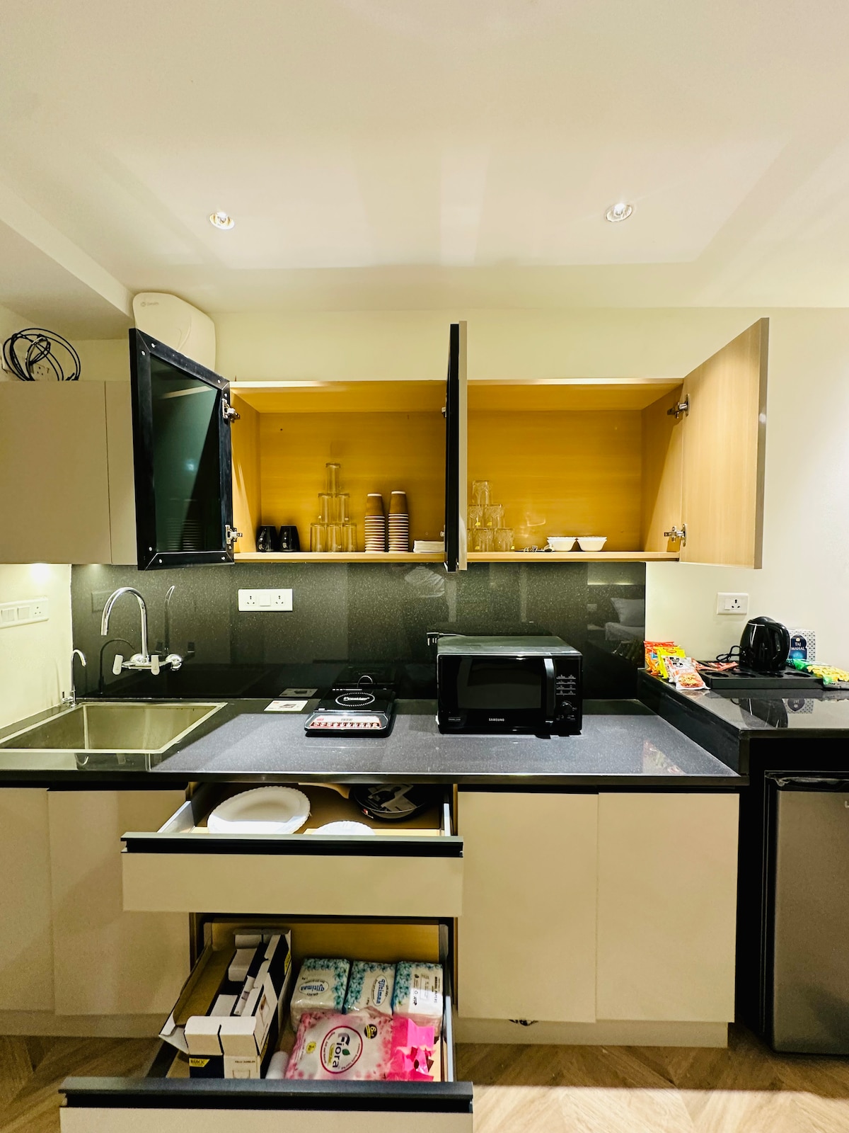 Un studio modern și confortabil în Greater Noida, cu conectivitate directă la metrou și la o scurtă plimbare cu mașina până la India Expo Mart. Șederea ta include detalii atente, cum ar fi un coș de bun venit, cărți selecționate și articole de toaletă esențiale. 🛏️ Bucură-te de un pat matrimonial, o canapea extensibilă, Wi-Fi rapid, Smart TV, birou și o bucătărie completă. 📍 Situat în aceeași clădire cu Burger King, Domino's, California Burrito și cafenele. 🚆 La doar câțiva pași de stația de metrou Delta 1. Fourwalls - O mică ședere făcută cu dragoste 💙