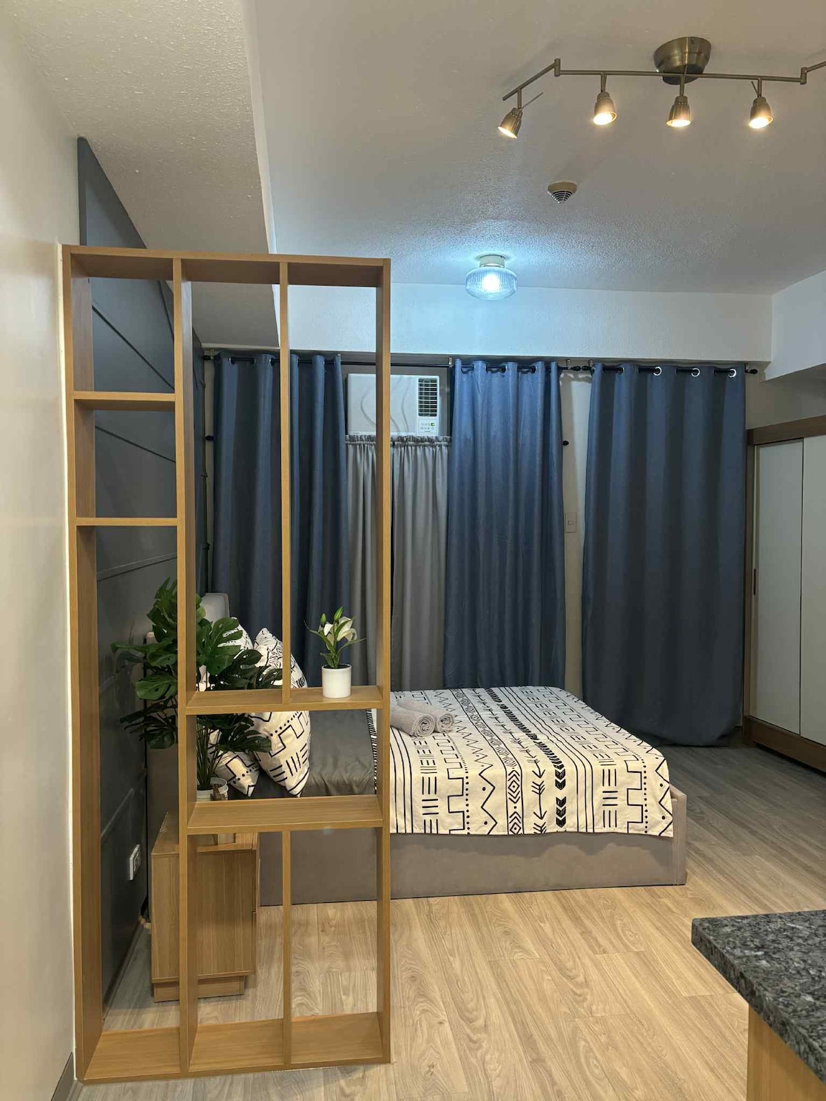 Welcome to your Clean, and modern home in Eastwood City! This Modern, stylish condo is perfect for business travelers, couples, and staycations. ◆ Hotel-quality queen bed for a restful sleep ◆ Modern lighting and bright, relaxing interiors ◆ Full air-conditioning for all-day comfort ◆ Fast WiFi ideal for work or streaming ◆ Smart TV with Netflix & YouTube ◆ Well-equipped kitchenette ◆ Clean bathroom with hot & cold shower ◆ Soft couch & warm layout perfect for unwinding after a long day