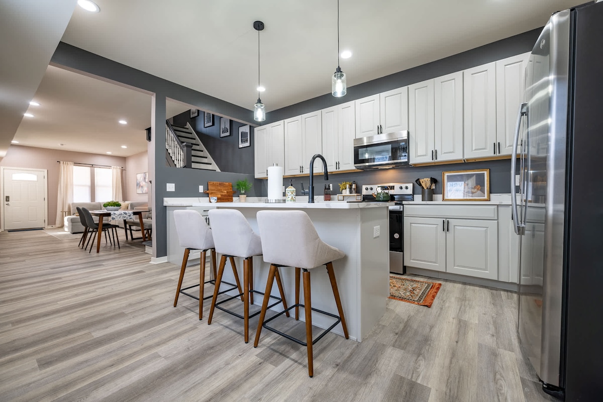 Casă elegantă în apropiere de centrul orașului, un amestec perfect de confort, eleganță și confort. Aproape de centrul orașului și de arenele de fotbal/baschet/concert. La 3 km de IN State Fair, apreciatul cartier Bottleworks și Mass Ave. Bucură-te de o bucătărie modernă de designer cu blaturi de marmură și aragaz. Zonă spațioasă LR cu TV de 56"pentru relaxare și divertisment. Garaj privat atașat pentru 2 mașini. Intrare fără cheie. Include 2 băi complete și 2 băi și jumătate.