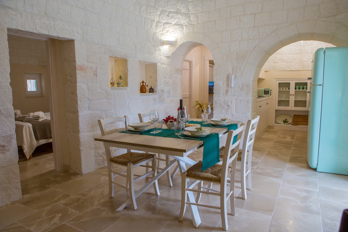 Acest spațiu unic, sculptat în interiorul trulli tradiționale, are propriul farmec și îți permite să experimentezi adevăratul spirit al Văii Itria. Intri printr-o pergolă veche de căpșuni și struguri. Bucătăria și baia sunt amplasate în nișe, în timp ce zonele de luat masa și de dormit sunt situate într-un trullo sarazin și un trullo înalt. Curtea privată și piscina infinită din apropiere oferă vedere la vale și la orizontul Ceglie Messapica.