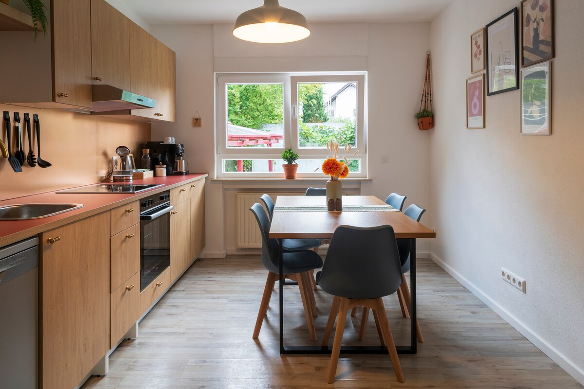 Bine ați venit în apartamentul nostru confortabil cu 2 dormitoare, aproximativ 60 mp cu intrare privată. Apartamentul este situat central: Centrul oraşului cu zone pietonale şi staţia de autobuz, precum şi natura sunt toate la câţiva paşi (fiecare doar 300m). Legăturile de transport spre Frankfurt City și aeroport sunt excelente. Și, din moment ce apartamentul se află într-o casă cu pereți groși, este plăcut temperat, chiar dacă este foarte cald afară.