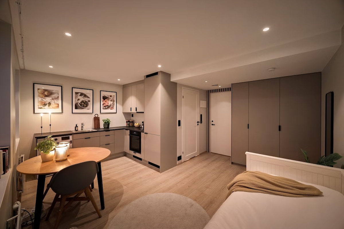 Et stemningsfullt studio med stor balkong – midt i byen, med en varm og rolig atmosfære i mørke farger. Her bor du i et hjem med personlighet, ikke et vanlig hotellrom. Alt ligger innen gangavstand: dagligvarer, restauranter, barer, apotek og grønne parker. Kollektivtransport er lett tilgjengelig, og bylivet er rett rundt hjørnet. Perfekt for deg som vil bo sentralt, komfortabelt og litt annerledes. Unik atmosfære og en lun, hjemmekoselig følelse venter på deg.
