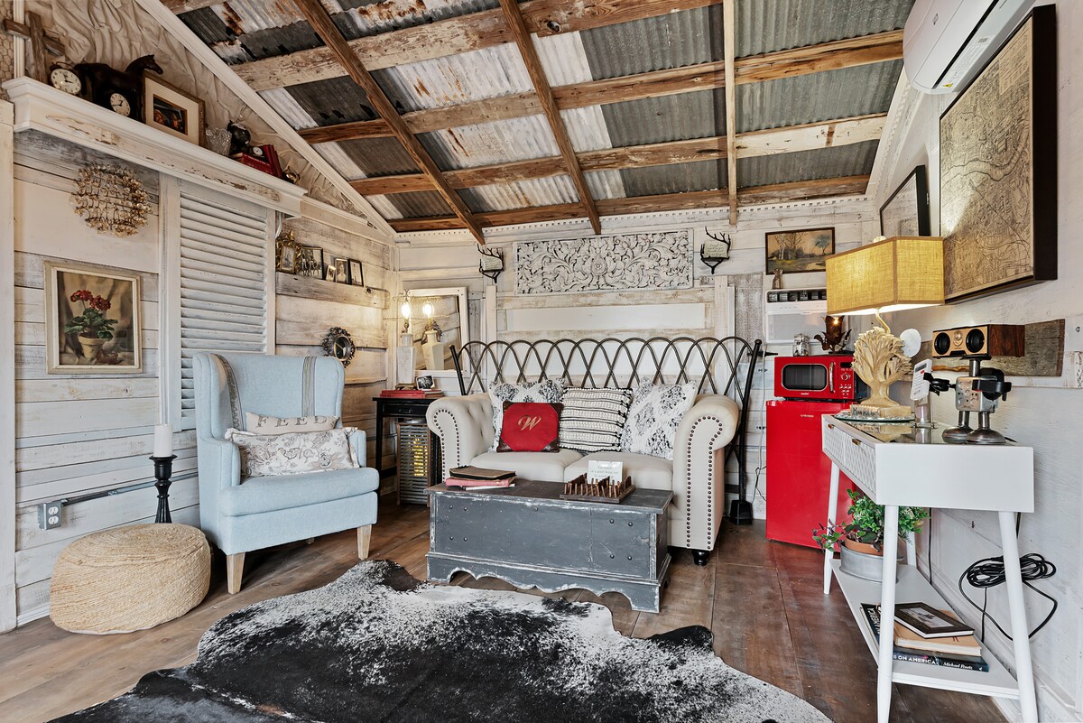 Cowgirl Riviera is a private 1920’s barndo with 1 bedroom, 1 large bath, a living area including small refrigerator, microwave and a coffee bar, 2 private patios with tables and chairs. 3 types of Grills, black stone griddle available in Grotto bar area. Smart TV and Wifi make this an ideal place to rstay and relax for 1-2 guests. Parking is 1 car covered, 1 car open, fully fenced. Enjoy nature views and a relaxing getaway. Fully lighted area with 1/2 mile figure 8 walking/running path.