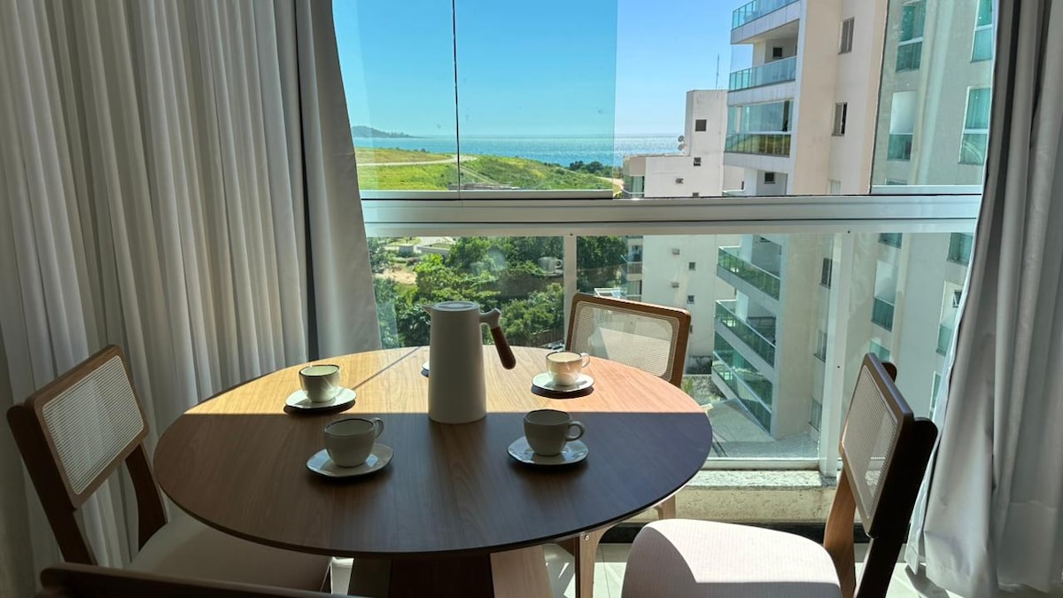Apartament cu vedere incredibilă la ocean, situat în Mirante Ipiranga, cu fața la ocean, oferind liniște totală și ventilație naturală excelentă, precum și acces facil la principalele plaje din Guarapari. Are o cadă cu vedere la mare, o bucătărie completă cu aparate de calitate superioară, o canapea extensibilă queen, televizoare de 56” în living și dormitor, precum și aer condiționat și o mașină de spălat și un uscător. Ideal pentru cei care caută confort, liniște și o experiență peste standard în Guarapari.