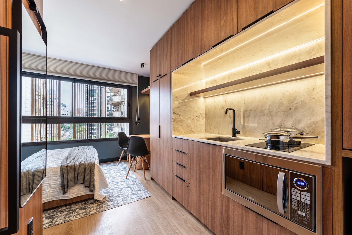 Estúdio espaçoso com muito design, arquitetura e a melhor vista de São Paulo. Loft completo! Com cama queen, closet, ar condicionado silencioso, cozinha completa, home office, WI-FI, TV 55” e uma belíssima banheira de imersão, de onde pode apreciar o seu drink preferido e curtir uma vista apaixonante. São Paulo toda estará há poucos minutos de você. Acesse o metrô andando apenas 200m. Reserve com tranquilidade! Proporcionaremos uma excelente hospedagem e uma ótima experiência!