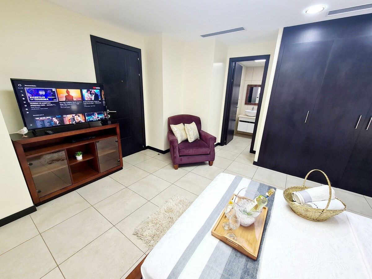 Ecusuites 📲 +593/99406/3474 Habitacion de Lujo con vista al Río 1009 y Desayuno☕️, Entrada independiente y baño privado. Ubicacion privilegiada por estar en piso alto, lo cual brinda una espectacular vista. Elegante decoracion, Full amoblado, Edificio Torres Bellini 1, Puerto Santa Ana a lado del Hotel Wyndham, a 3 minutos Aeropuerto. Ubicacion en el mejor sector Turístico cerca Malecón 2000 y Las Peñas.