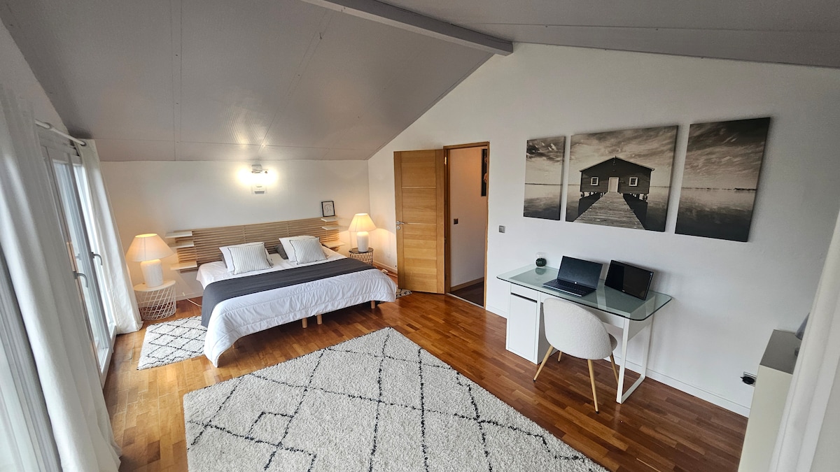 Experimentează un moment atemporal între îndrăgostiți în această cameră a iubirii de lângă Bassin Arcachon și Biscarosse. Bucură-te de o cadă cu🛁 hidromasaj XXL🛏️, un pat matrimonial🔥, un scaun tantra și lasă-te fermecat de atmosferă: 🪞 Oglindă de tavan Duș 🚿 dublu 🌿 Terasă privată Rezervă acum... și lasă magia să funcționeze 💫❤️🔥