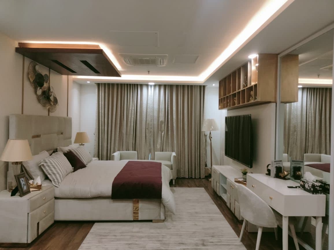 Experience designer living at Luniq, just steps from MM Alam Road the heart of Lahore’s cafes, boutiques, and nightlife. • 🛋️ Aesthetic lounge with cozy rugs, hanging lamp & full-length curtains • 🛏️ Plush king-size bed with premium bedding & city views • 55” Android Smart TV with Netflix & YouTube Premium • 🍳 Fully equipped modern kitchen with essentials • ⚡ Fast Wi-Fi for work or streaming • 🔑 Seamless self check-in for complete privacy • 🌆 Prime Gulberg location