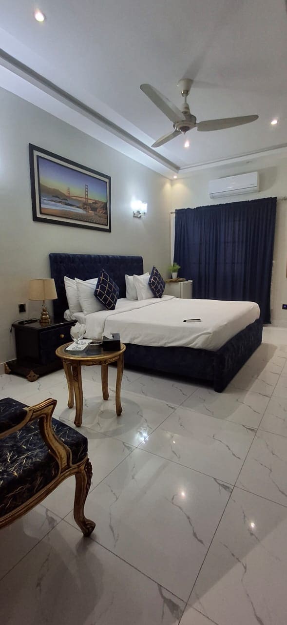 Este o unitate independentă luminoasă, cu decor modern, 3 dormitoare cu băi atașate, lounge spațios, bucătărie complet utilată și un acoperiș. Toate camerele cu 3 paturi au aer condiționat cu mobilier confortabil pentru a ajuta la stabilirea stării de spirit pentru o ședere perfect relaxantă. Poziția clădirii o face ideală pentru familii sau grupuri mari, care pot găzdui cu ușurință 6-7 adulți și copii La 15 minute de mers cu mașina de AEROPORT, Lucky One Mall și Dolmen Mall Tariq Road. De asemenea, 7 minute cu mașina până la (Maskan) food street.
