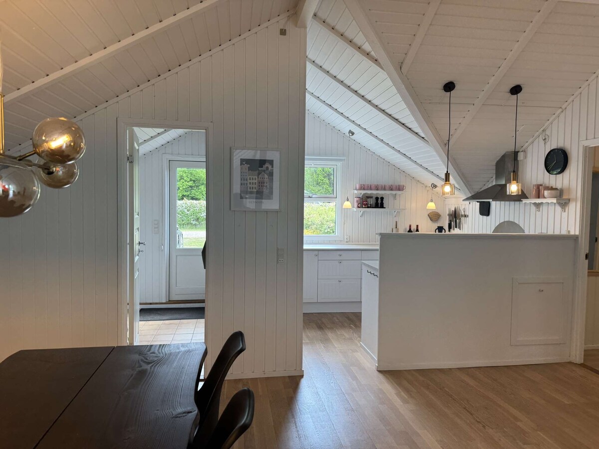 Relaxați-vă cu întreaga familie în această locuință liniștită. Potrivită pentru familii cu copii. Grădină super închisă cu leagăne, tobogan și corabie piraților. Pod amenajat cu loc de joacă. Internet prin fibră optică - bun pentru teme. Pompă de căldură nouă și eficientă și sobă nouă, ecologică. Cea mai bună plajă cu nisip din Danemarca la 200 m Magazin de înghețată cu fast-food 300m Pădure 400m Supermarket 5 km.