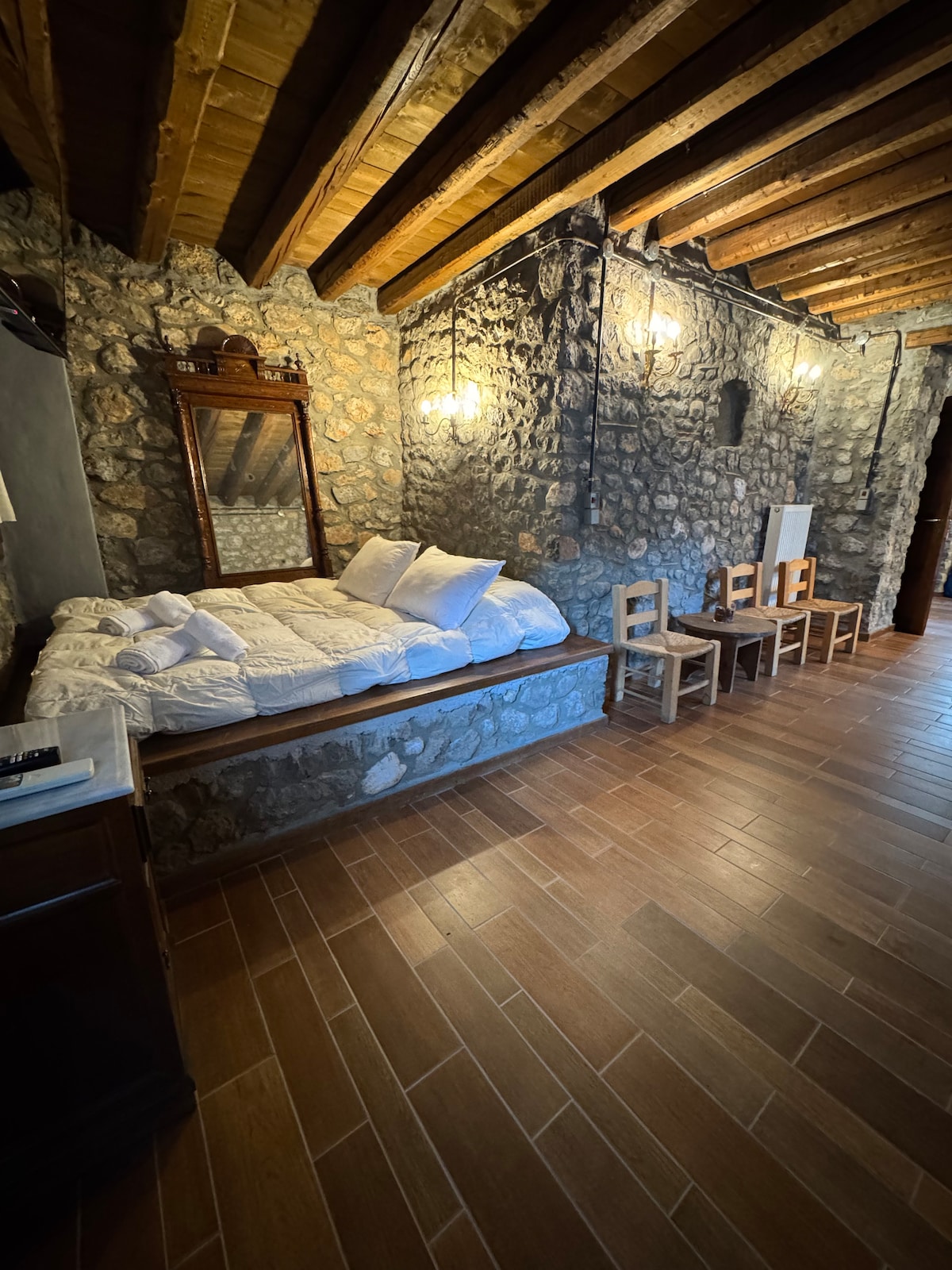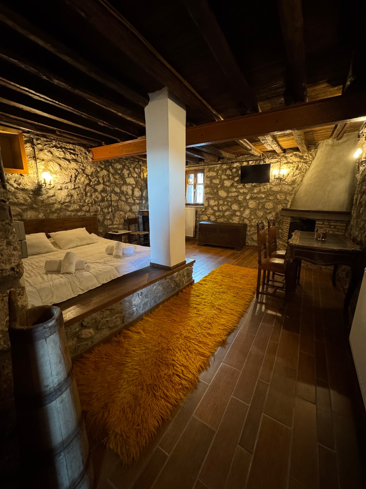 Studio cu o cameră de 35 mp și pat dublu. Vedere de la Muntele Velia la Erymanthos și orașul Kalavryta. Accesul la etajul al treilea prin scara exterioară din piatră. Încălzire autonomă, șemineu din piatră, mini-frigider și aragaz electric pentru băuturi. Mansarda are un tavan evident din lemn. Nu are balcon, dar există balcoane comune și o curte. Lemnul pentru șemineu este furnizat la cerere. Coacerea în șemineu nu este permisă.