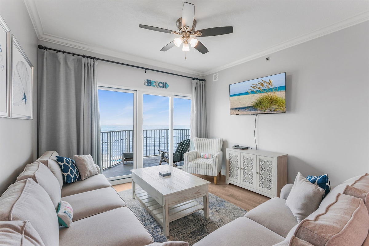 Admiră priveliștea maiestuoasă a plajei pe măsură ce pășești în apartamentul nostru de la etajul 14 al farului și intri imediat în modul vacanță. Începe să te relaxezi și să te relaxezi cu familia sau prietenii în apartamentul nostru de pe plajă, dotat cu 3 televizoare inteligente, un balcon mare, electrocasnice noi, jocuri, WiFi și decor de plajă peste tot. Fă unul dintre cele cinci lifturi pentru o plimbare pe plaja de nisip cu zahăr în timpul apusului de soare până la Sea N Suds sau The Hangout și bucură-te de fructele de a fi în cea mai bună locație din toate țărmurile Golfului Mexic. Rezervă astăzi!