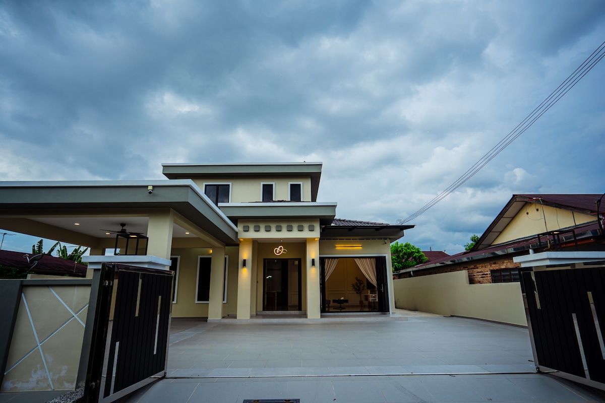 Bine ai venit în casa prefectului tău departe de casă în Ipoh! Acest bungalou de lux cu 4 dormitoare, frumos proiectat (până la 12 oaspeți), oferă o atmosferă primitoare, cu finisaje de înaltă calitate, lenjerie de pat de marcă și interioare elegante - ideal pentru familii, prieteni și escapade de grup. Întregul spațiu este curățat și igienizat profesional înainte de fiecare ședere, pentru a asigura liniștea tuturor oaspeților. IGIENA ESTE PRIORITATEA NOASTRĂ PRINCIPALĂ. Ne aflăm în locul în care faimoasele locuri culinare din Ipoh, atracțiile sunt la doar câteva minute de mers cu mașina.