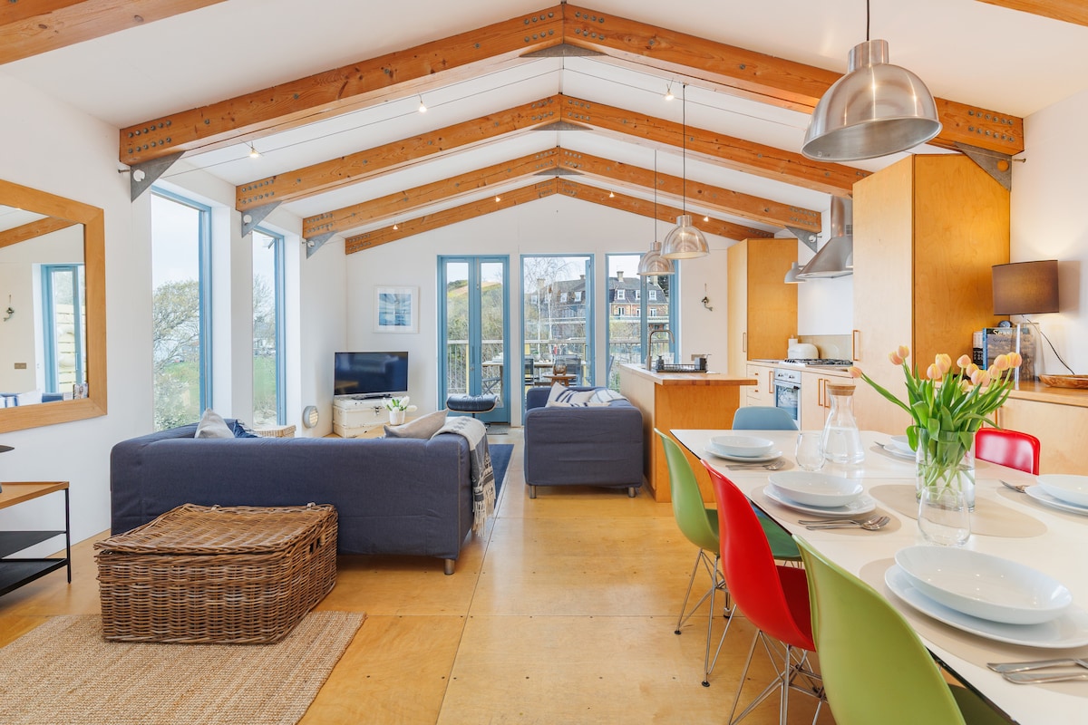 A standout seafront landmark on Lepe Beach, The Watch House is a lovingly restored former lifeboat and coastguard station, once used to combat smuggling across the Solent. With original features, a modern kitchen, wood burner, cosy window seat over the water, and views to the Isle of Wight, it’s a guest favourite—“an iconic beachfront stay” and “perfect relaxing getaway.” Pet-friendly with parking for two, perfect for families, couples, or friends.