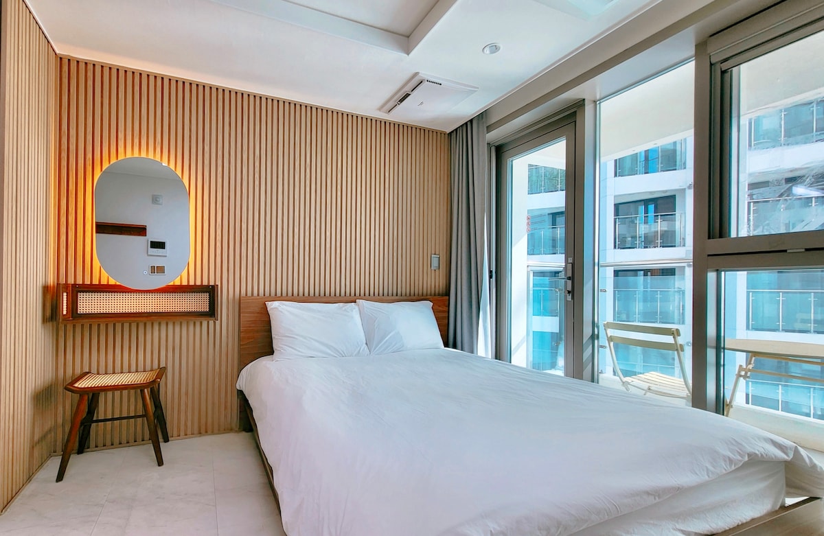 „Reducere suplimentară de la 2 nopți”#Preț pentru 4 persoane#În centrul Haeundae#2 paturi queen-size#20% reducere la turul cu iahtul#Mașină de spălat și de uscat rufe