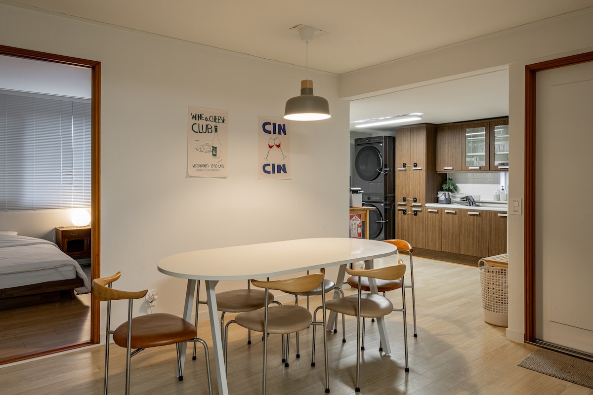■ 본 숙소는 미스터멘션 특례를 적용받아 내국인 공유숙박 합법 업체로 등록되어 운영되고 있습니다. ■ 이곳을 찾은 이들의 소중한 시간을 위해 고민하고 또 고민했습니다. 특별하고 아름다운 그들에게 이 공간을 선물해드립니다. • 인원은 2인 기본이며, 최대인원 4인까지 가능합니다. • 체크인 오후3시 체크아웃11시 • 어메니티 드라이기, 샴푸, 린스, 바디워시, 핸드워시 • 어메니티 미디어 & 기타편의 55인치TV, WIFI, 드럼세탁기, 시스템에어컨 • 어메니티 다이닝 4인용 다이닝 테이블, 냉장고, 전자렌지, 전기포트, 네스프레소(버츄오 팝), 식기, 수저세트(4인), 조리도구, 와인잔등 컵류, 소금, 허브솔트, 식용류, 설탕 • 주차는 불가합니다 다만, 집앞 짐내릴수 있는 골목주차 가능합니다 참고해주세요. 가까운 위치 사설주차장이 있습니다. 안내가 필요하시면 문의주세요! • 조용하고 편안한 휴식이 가능한 소음이 적은 주택가 단독주택 2층 입니다.