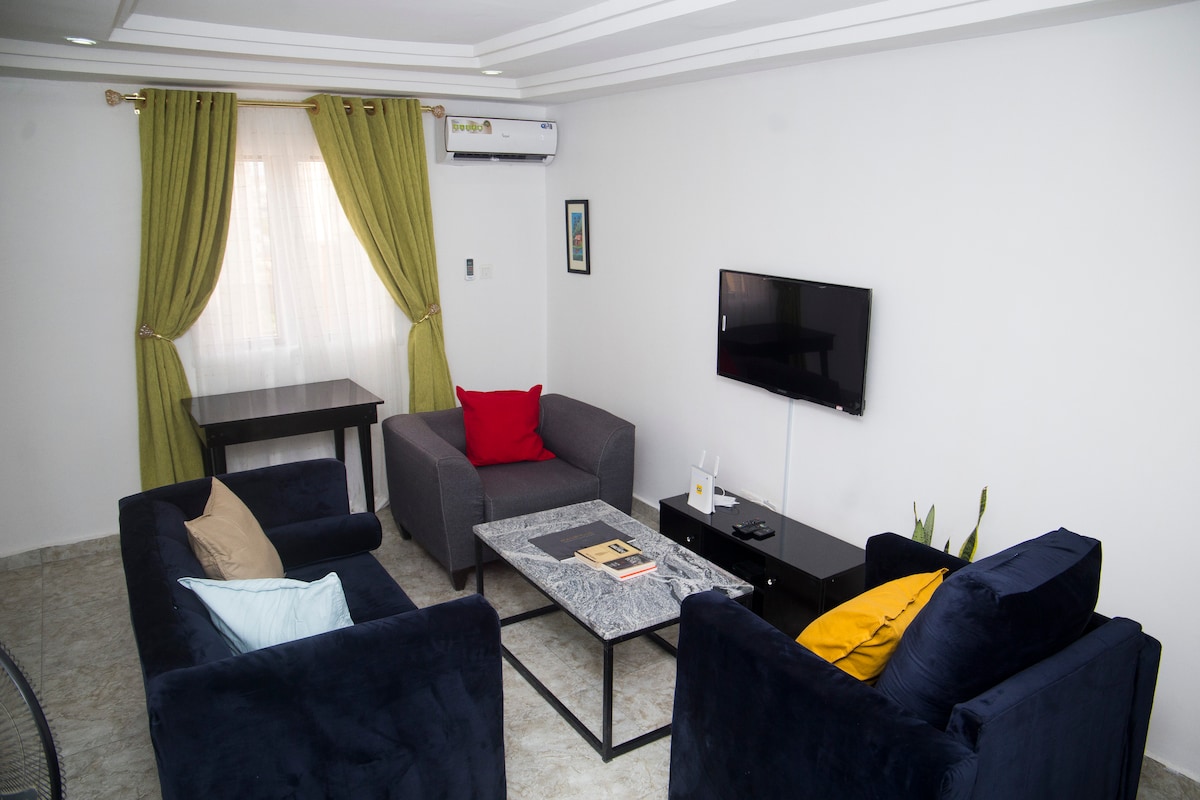 Acest anunț este un apartament cu un dormitor situat central și finisat cu gust pentru a garanta un sejur confortabil. Apartamentul este dotat cu energie de rezervă pentru a asigura o sursă de alimentare non-stop, curățenie zilnică, Wi-Fi, bucătărie complet utilată și un spațiu de lucru dedicat. Apartamentul este situat central și ușor de accesat marile restaurante, piețe, mall-uri și zona centrală din Abuja, cu un timp foarte scurt de traseu.