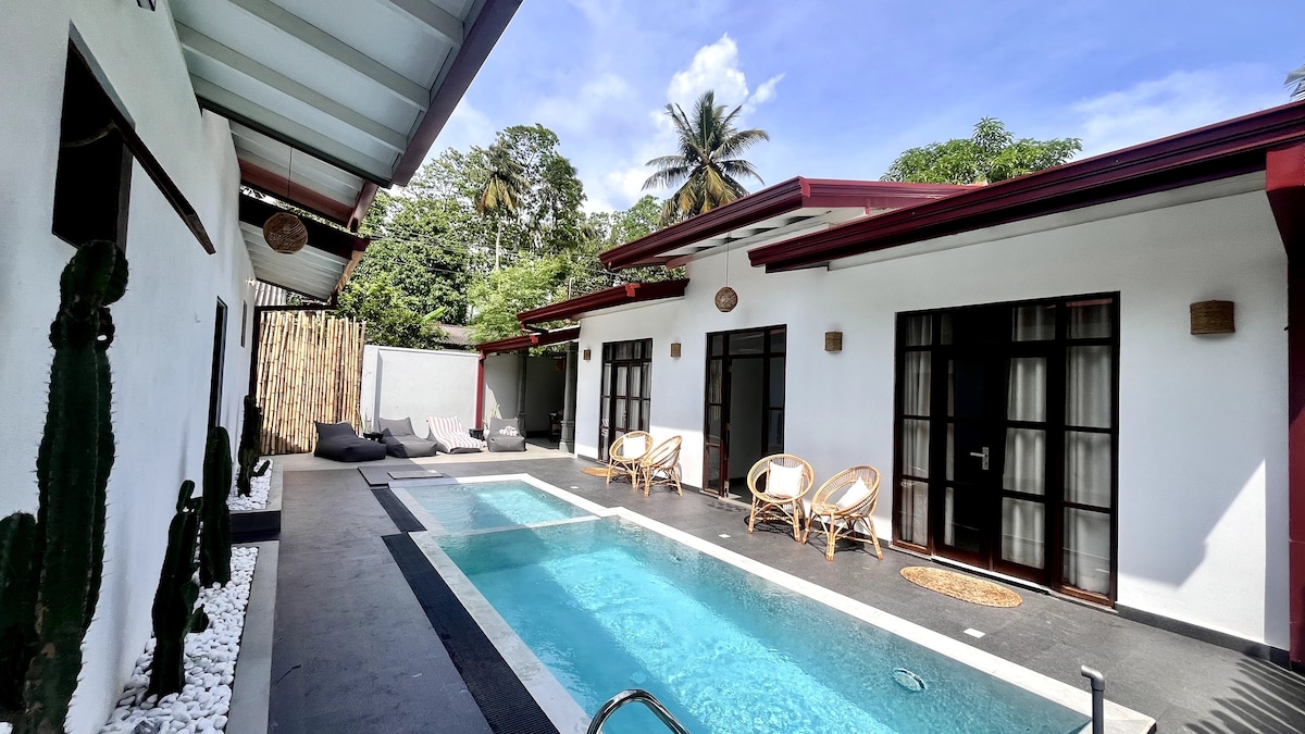 Casă pe plajă recent renovată în centrul orașului Ahangama, la punctul de surf Animals. - 20 de secunde până la plaja frumoasă - Internet prin fibră optică pentru lucrul de la distanță - Chicinetă cu dotări de bază - Grădină privată proprie - Distanță de mers pe jos până la magazine, cafenele și baruri - Duș exterior - Garsonieră spațioasă cu pat king-size și o canapea extensibilă - Duș de apă caldă