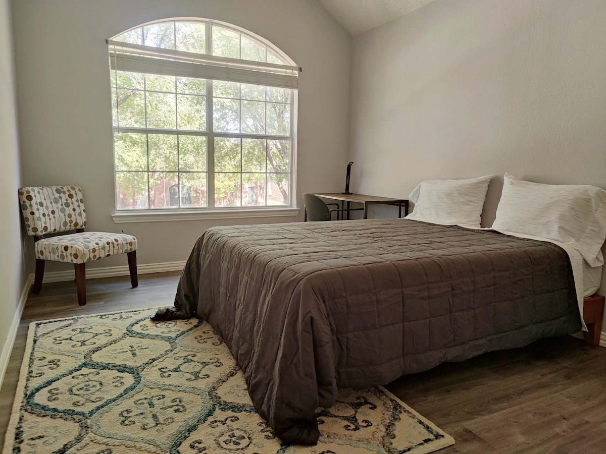 Intrare privată pe ușa principală, „nu baie comună” confortabilă cu 1 dormitor, 1 baie în partea din față a locuinței, a doua cameră va fi 🔒 în timpul șederii tale. Acest spațiu se află sub același acoperiș, separat de gazdă prin uși franceze încuiate, acoperite cu perdele, oferind oaspeților intimitate completă Gazda va folosi aleea din spate/intrarea în garaj în timpul șederii tale • Un dormitor: cu pat dublu • Bucătărie / chiuvetă • 1 baie • Check-in independent • Parcare pe stradă chiar în fața casei • Mini split