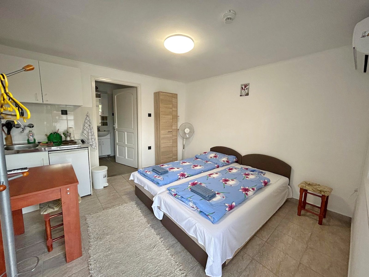 Apartament confortabil, cu aer condiționat, pentru 2 persoane, la 1200 de metri de plaja Hajdúszoboszló. Parcarea gratuită este asigurată într-o curte închisă, Wi-Fi rapid, bucătărie bine echipată. Grătarul în aer liber și gătitul sunt disponibile pe terasa din fața apartamentului. Cartierul este calm, liniștit și sigur. Perfect pentru cupluri, prieteni, dar și pentru cei care călătoresc singuri.