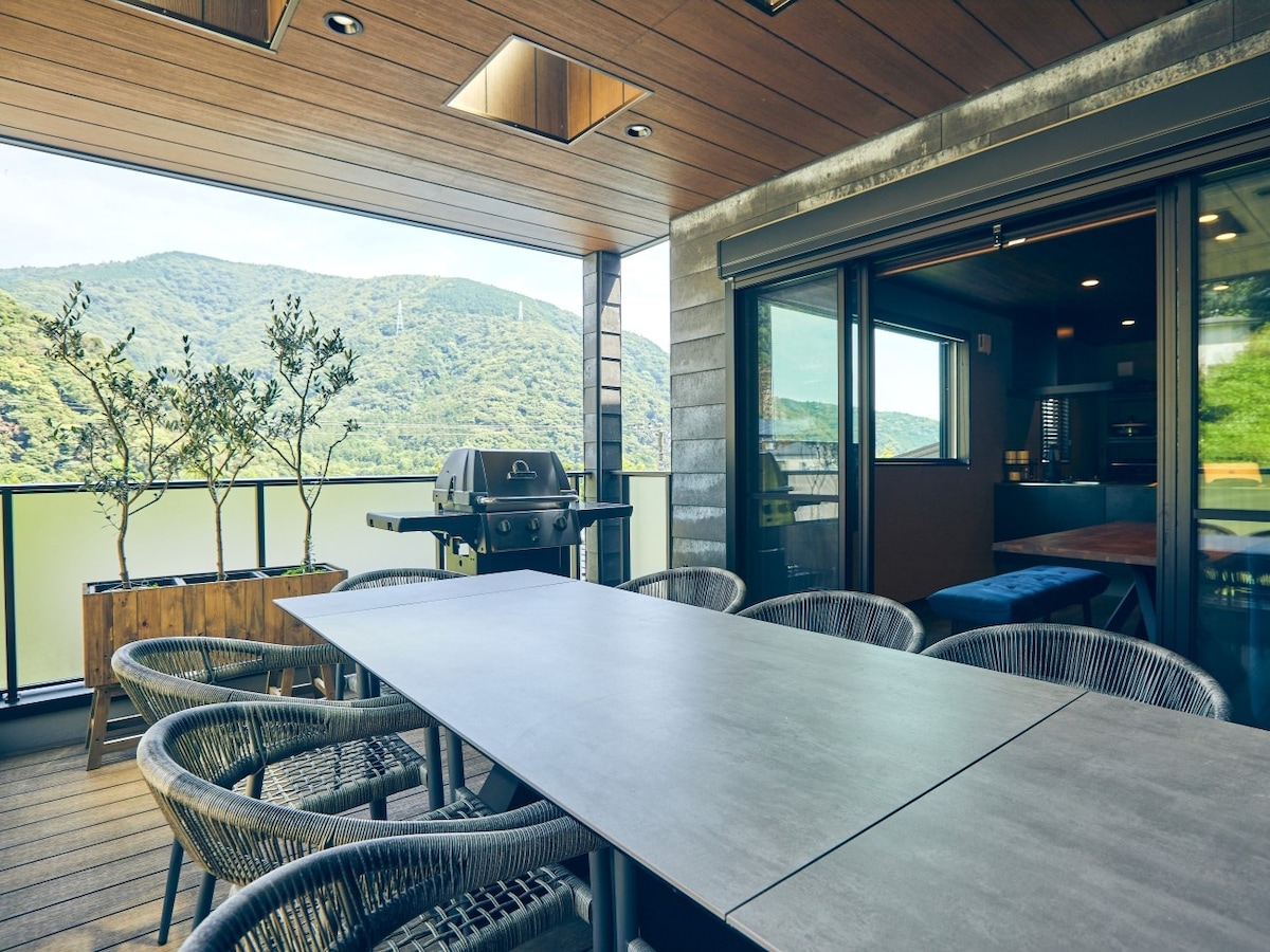 [Întreaga casă cu izvor termal] Grătar deschis, salată verde shabu-shabu și room service pentru băuturi pe terasa mare!