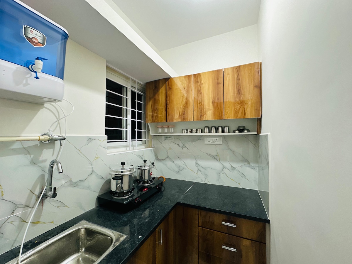 Relaxează-te în acest spațiu calm și elegant, perfect pentru o seară relaxată sau chiar pentru o muncă de acasă. Livingul se deschide într-un foișor spațios în aer liber, precum și într-un bar în aer liber. Dormitorul prezintă, de asemenea, un balcon. Apartamentul are o bucătărie complet utilată și o zonă de utilități. Locul este situat în principalul centru tehnologic din Bangalore și este aproape de mai multe companii IT, restaurante, spitale și noduri de transport.