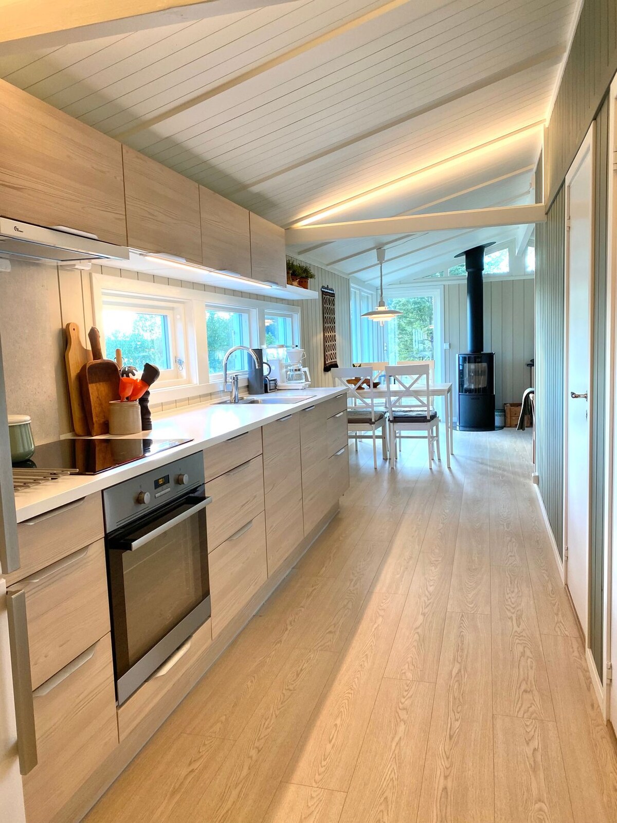 Bucătărie și living cu pat de zi de 155 cm și vedere la mare. Dormitor mare cu pat dublu de 160 cm. Bucătărie cu cuptor/plită cu inducție, frigider/congelator, veselă și cuptor cu microunde. Baie cu duș, mașină de spălat și uscător automat de rufe. Curte pavată și patio mare cu iarbă. Parcare afară. La 10 minute de mers pe jos de apă, cu plaje, stânci și port de agrement, pădure la 1 minut în spatele casei, 15 minute de mers cu mașina până în centru, la 10 minute de cumpărăturile Nordby. 20 de minute de Koster cu barca. Zonă liniștită.