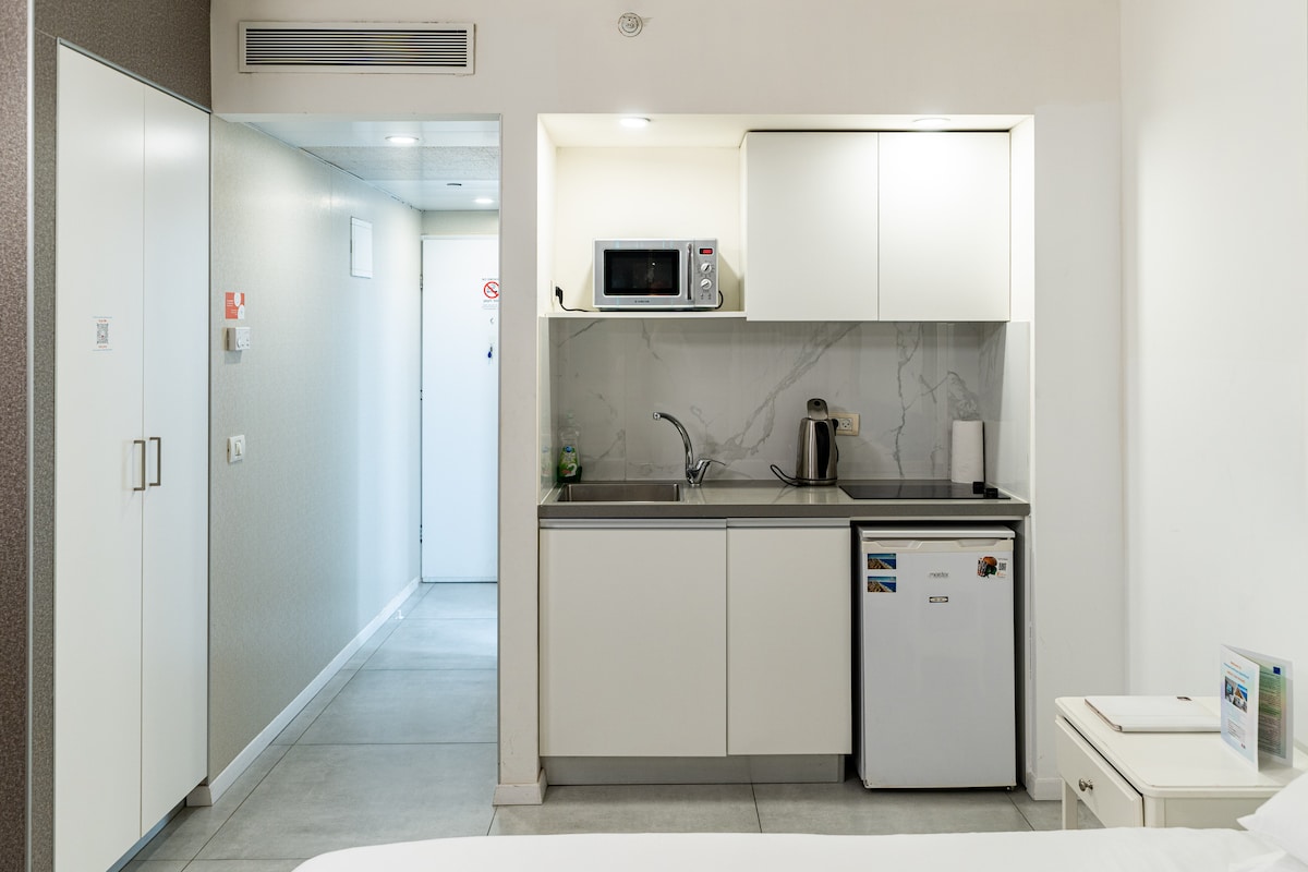 SeaView ApartHotel is a Studio apartments in heart of Netanya. All apartments locates in the 20 store building which is located on the shores of the Mediterranean Sea in new area within 15 min walk to the equipped sea beach and city center where you may find plenty of restaurants and shops. In the building you may find: Grocery Store 24/7; El Gaucho restaurant with Argentinian cuisne; Fitness club; Synagogue On Fridays restaurant of ready food for take away. 24 hour guard in Lobby