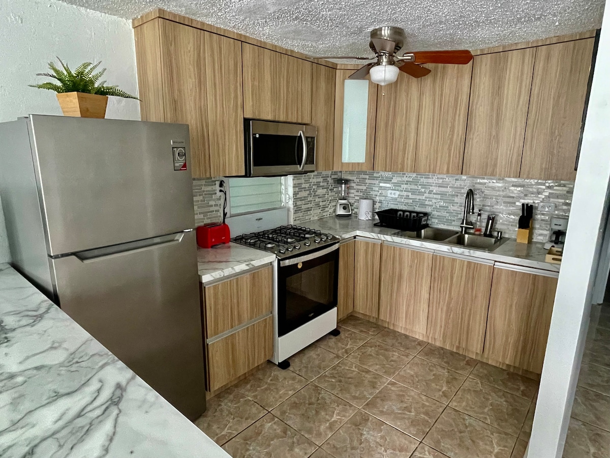 Cozy apartment with private garage in a safe area, just 15 minutes from San Juan, the Puerto Rico Coliseum, Hiram Bithorn Stadium, the Convention Center, the Airport (SJU), and close to important hospitals and healthcare centers. Also near casinos, bars, restaurants, Plaza del Sol, and more. Fully equipped kitchen, 2 Smart Roku 4K TVs, comfortable living room, 2 A/C units, and a backup generator to ensure there's always power. Perfect for your vacation or work, with comfort and security.