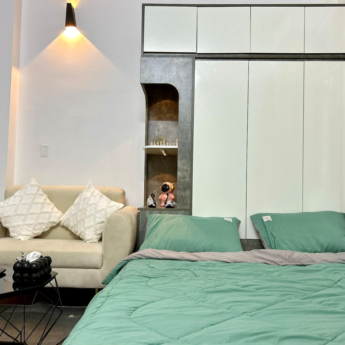 Camera 101 este o unitate studio confortabilă situată într-o locație excelentă, la 3 minute de aeroport și la 10 minute de centru. - Camera este proiectată în stil japonez, cu lumină naturală completă, mobilier din lemn și complet echipată cu ustensile de bucătărie pentru a aduce un sentiment cald ca acasă - Situat la parter cu ușă proprie, foarte privat și ușor de adus bagaje. - Camera este dotată cu un proiector modern instalat cu Netflix pentru a te ajuta să vizionezi filme bune, cum ar fi un mini home cinema.