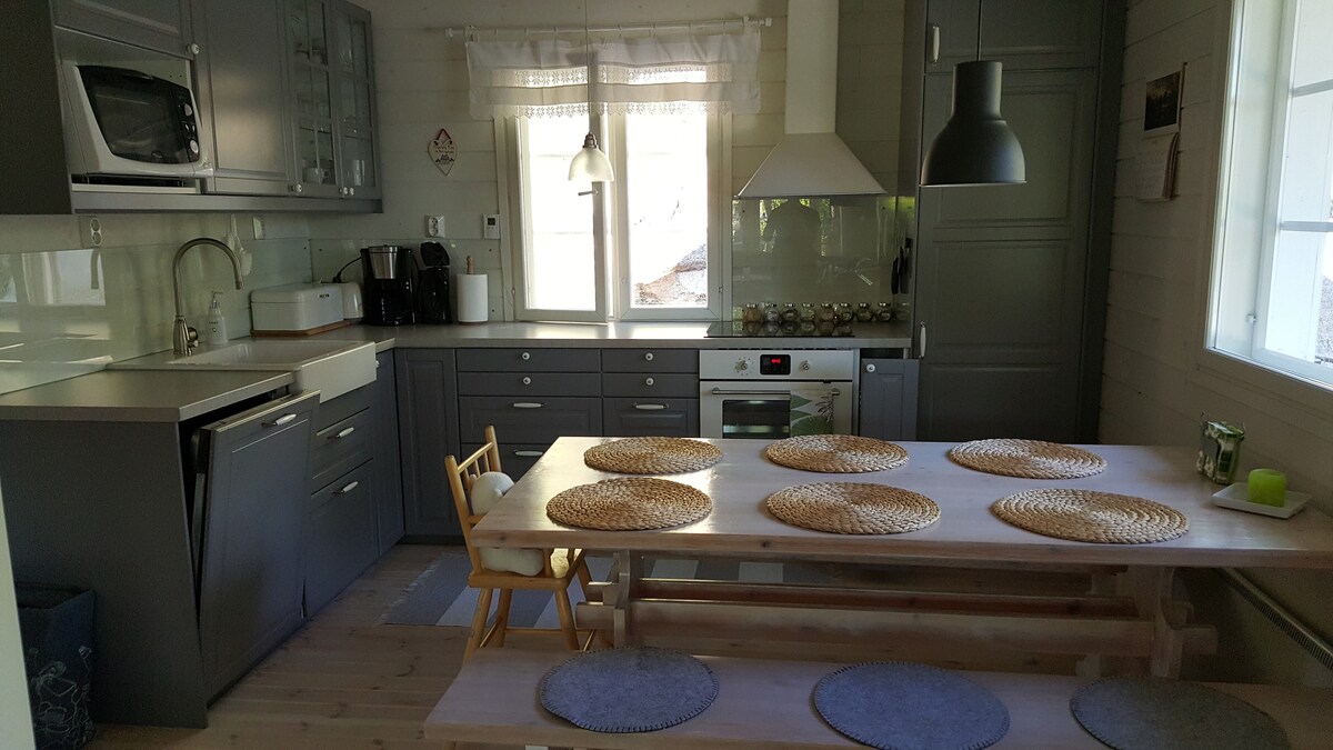 120 neliöinen omakotitalo järven rannalla, jossa upea terassialue aina valmiilla ulkoporealtaalla viidelle. Lasipaviljonki on rantasaunan yhteydessä sekä ulkobaari. Hyvin varusteltu talo mahdollistaa rentouttavan loman jokaisena vuoden aikana. New beautiful house (120m2) with amazing lake view. The house is well equipped and has a large terrace, lakeside sauna with a glasshouse and an outside bar. There is everything you need for relaxing and lovely vacation in peaceful nature.
