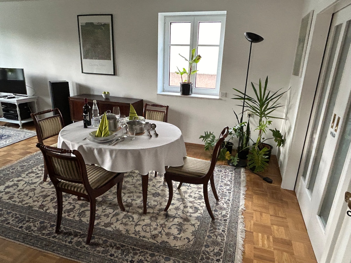 Apartamentul cu dragoste al Claudiei, de aproximativ 40 mp, este situat pe partea laterală a casei noastre cu vedere la grădină din centrul orașului Künzell, la doar câteva minute de ieșirea de pe autostradă (A7) Fulda Mitte. În grădină există posibilitatea să zăbovești între meri și flori. La câțiva pași se află magazinul, brutăria, zona frumoasă a parcului gastronomic. Cu mașina, bicicleta sau autobuzul te afli în câteva minute în centrul frumosului oraș Fulda.