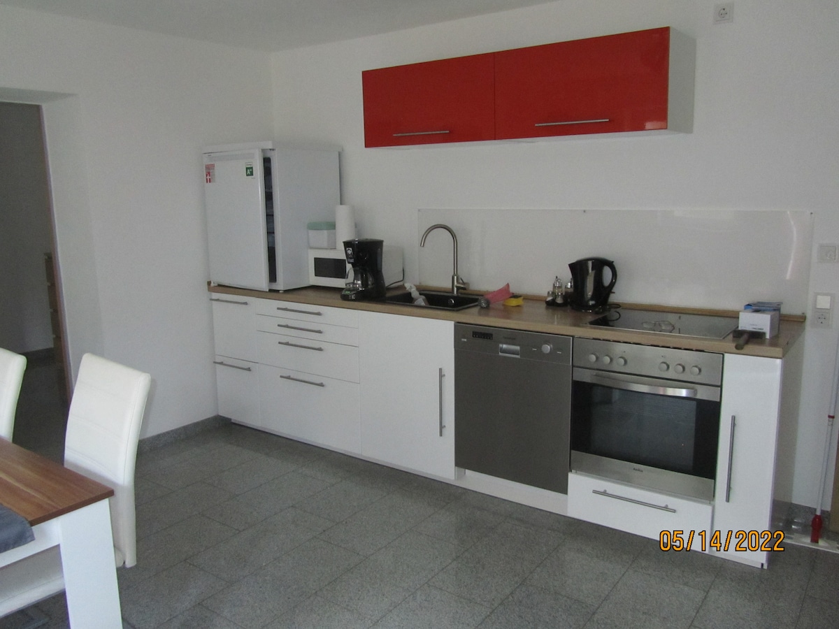 Apartament confortabil și modern mobilat la parter, cu 55m2 într-o casă Art Nouveau reprezentativă din 1909 . Apartamentul închis are un dormitor separat pentru 2 persoane cu un pat din lemn masiv 160x200cm din stejar uns, una dintre cele mai bune saltele pe care Stiftung Warentest le-a testat vreodată! Pentru a avea chef de zona noastră, există o bere regională în frigider pentru fiecare adult. Nu există ulei de gătit disponibil. Mobilierul de grădină este disponibil în curte.
