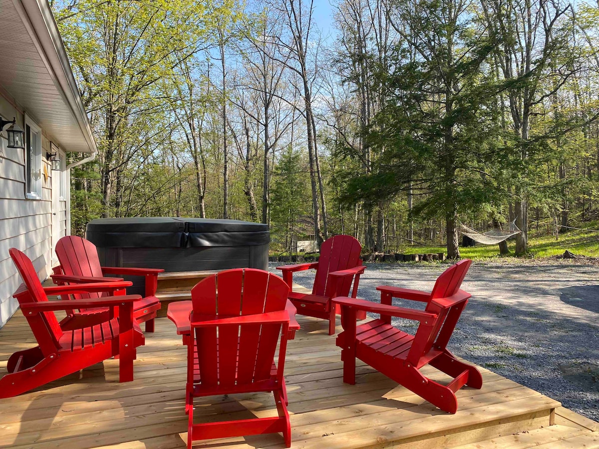 Evadează în acest refugiu confortabil din Blairton, perfect pentru până la 6 oaspeți. Casa principală îmbină stilul modern și vintage cu o bucătărie completă, un spațiu de locuit plin de plante și o baie recent renovată, cu podea încălzită luxoasă. Un bunkie detașat oferă mai multă intimitate. În aer liber, bucură-te de o cadă cu hidromasaj, o verandă mare și o groapă de foc într-o curte liniștită. Ideal pentru relaxare sau explorarea zonei, acest paradis fermecător combină confortul și natura pentru o ședere memorabilă.