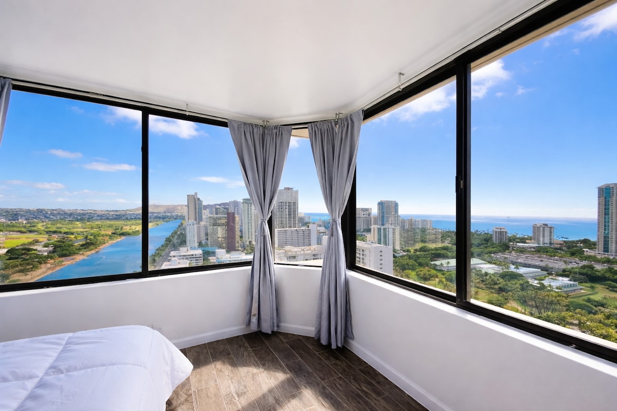 Apartament renovat la ultimul etaj cu 1 dormitor/1 baie în Waikiki. Frumoase 180 de priveliști panoramice neobstrucționate ale oceanului de la balconul Julietei. Vezi focurile de artificii de vineri seara și apusul de soare de sus! Pat matrimonial în dormitor. Baia are chiuvetă dublă, duș din sticlă. Bucătărie complet aprovizionată. Securitate non-stop la fața locului. Aer condiționat central, cablu, WiFi inclus. Parcare în garaj disponibilă pentru 35 USD pe zi. Cinci minute de mers pe jos până la plaja Waikiki, hotelul Hilton, laguna Duke și mall-ul Ala Moana