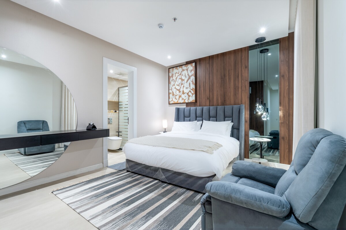 A luxurious studio with a modern and elegant design, located in the Al Murooj neighborhood, north of Riyadh. It is characterized by its tranquility, proximity to the metro station, and all events such as (The Boulevard, King Abdullah Financial Center (KAFD), Kingdom Arena (Al Hilal Saudi Club Stadium), Kingdom Tower, Al Faisaliah Tower, Riyadh Park Mall, Riyadh Gallery Mall, and many more), in addition to its proximity to all services and distinguished cafes.