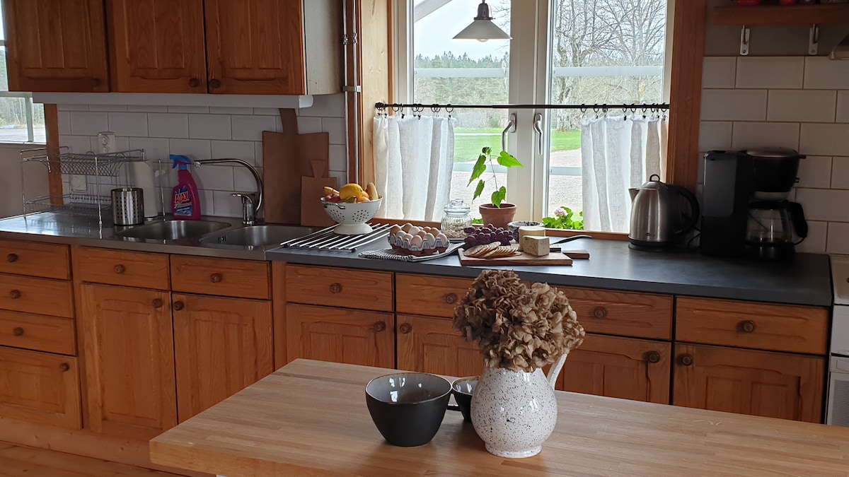 Relaxează-te împreună cu întreaga familie sau cu prietenii în această pensiune liniștită, situată pe proprietatea noastră. Aproape de natură, cu animale sălbatice după colț. Aproape de mare, de lac și de zonele de cumpărături. Cazează-te la țară, dar la doar o aruncătură de băț de centrul orașului. La 25 de minute de Göteborg! Trezește-te odată cu soarele dimineții, bea o cafea pe terasă și bucură-te de ciripitul păsărilor. Fă o excursie în pădurea plină de fructe de pădure, ciuperci și poteci primitoare. Distracție plăcută la cina de la apusul soarelui! Posibilitatea de a încărca mașina electrică peste noapte contra cost, 100 SEK