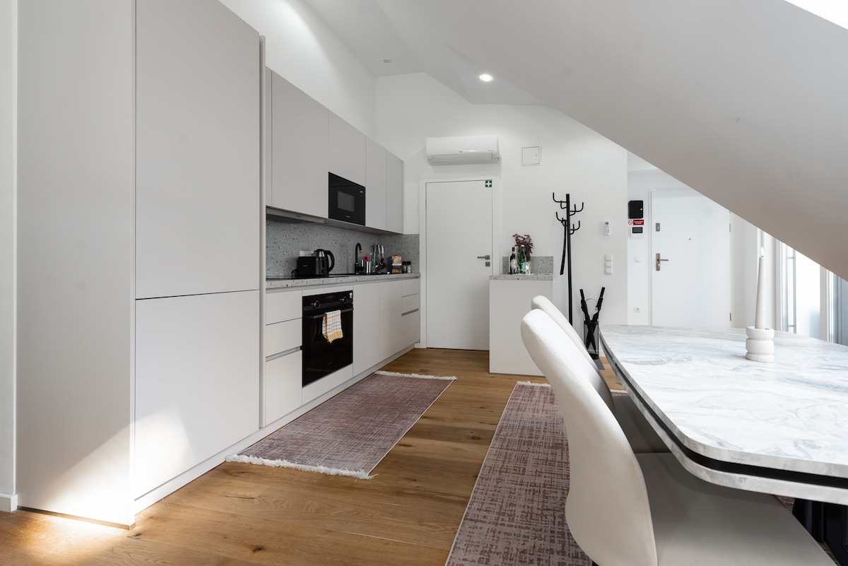Pășește în confortul apartamentului tău elegant de pe acoperiș, plin de soare, cu facilități remarcabile în centrul Vienei. La doar câțiva pași de vibrantul Radetzkyplatz și Dunăre, apartamentul promite un refugiu urban, la câțiva pași de cele mai bune restaurante, magazine, atracții și obiective turistice ale orașului. Viena autentică trăiește la cel mai înalt nivel! Pat matrimonial✔ king-size + canapea extensibilă Zonă de living în plan✔ deschis ✔ Bucătărie complet echipată ✔ Balcon privat ✔ Smart TV Wi-Fi ✔ de mare viteză ✔ Aer condiționat Citește mai multe ↓