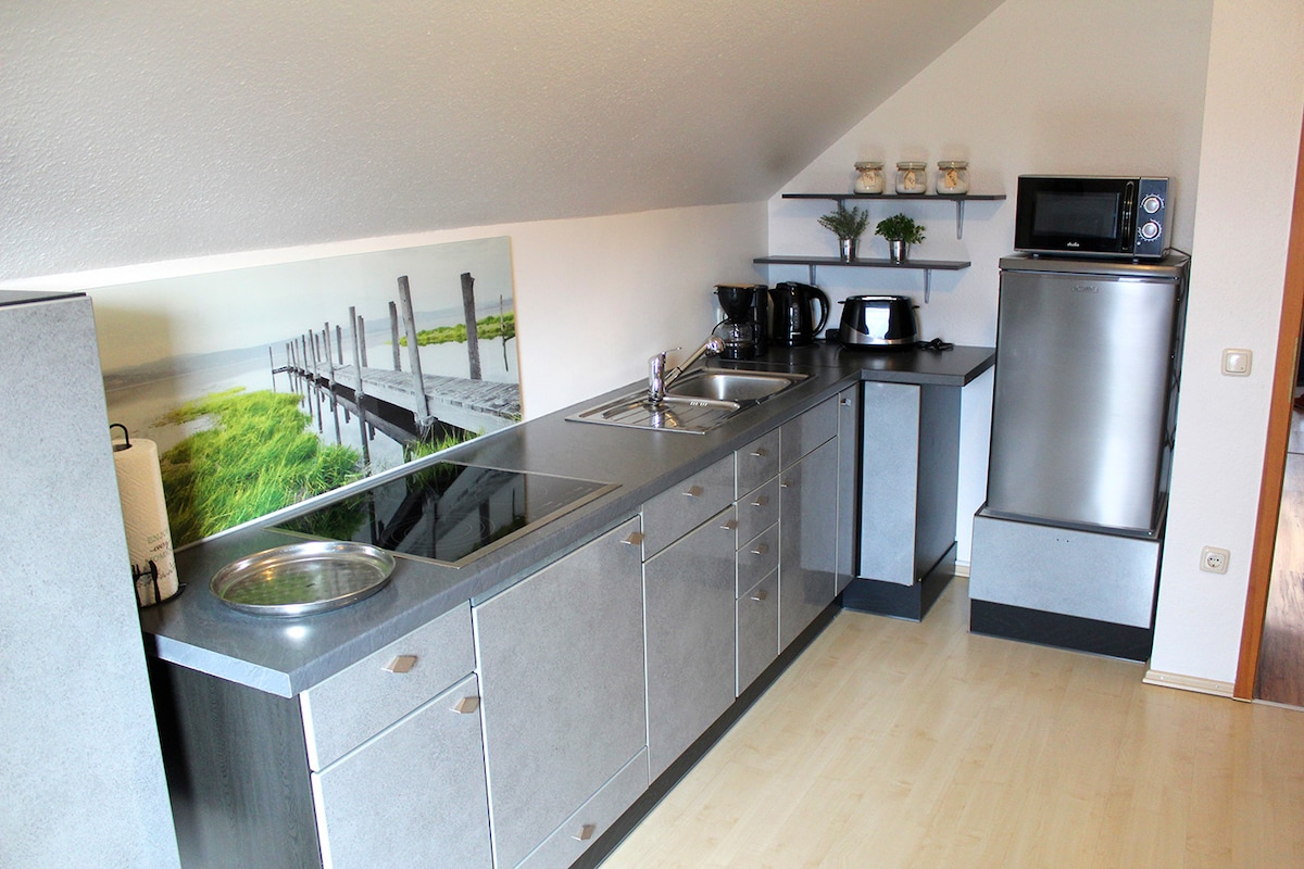 Apartament nou cu bucătărie complet utilată, baie, living, dormitor 1, dormitor 2 (disponibil opțional) și birou. Tot ce ai nevoie este chiar în fața ușii tale: cafenea cu înghețată, Brutărie, pizzerie, farmacie, biserică, o piață MIXTĂ (magazin alimentar) și stație de autobuz, sunt la doar câțiva pași. În plus special pentru șederi mai lungi: începând cu 3 nopți, vei primi un voucher de mâncare de 10 euro pentru Pizzeria Toscana (cu excepția lunilor) – distracție inclusă!